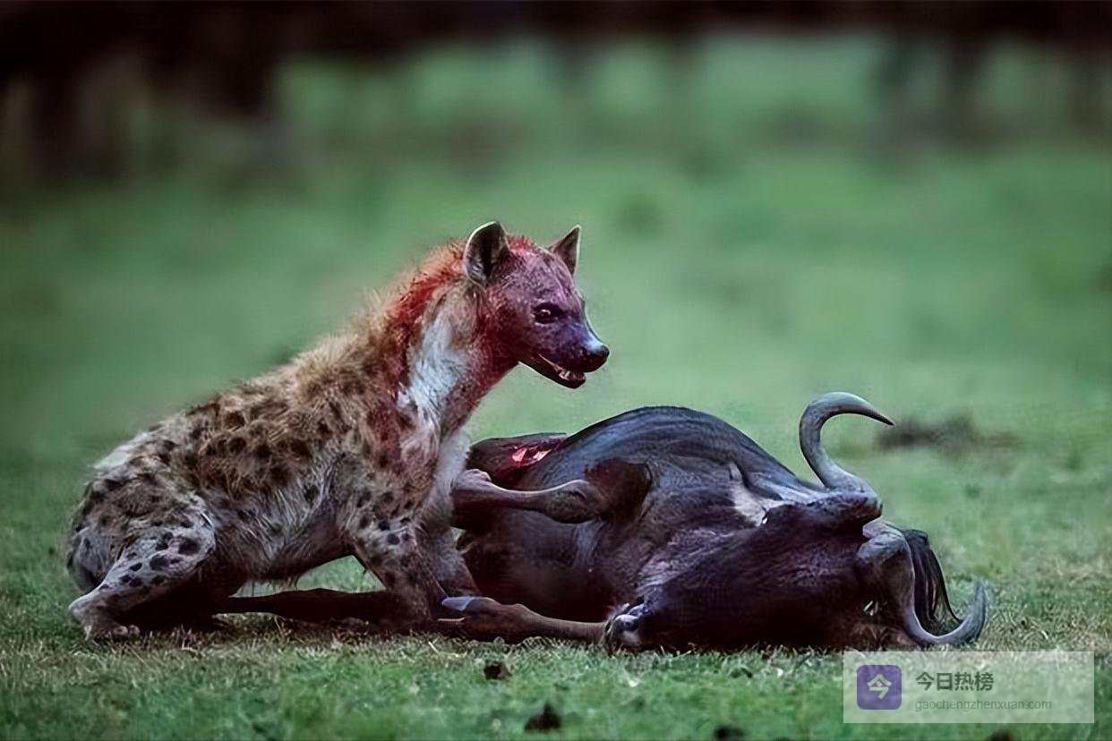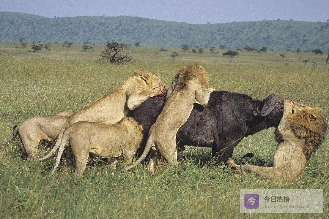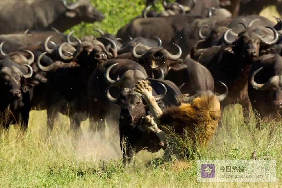 野牛集体合作反抗,狮子和斑鬣狗都很难捕获它们,甚至会被野牛反杀。