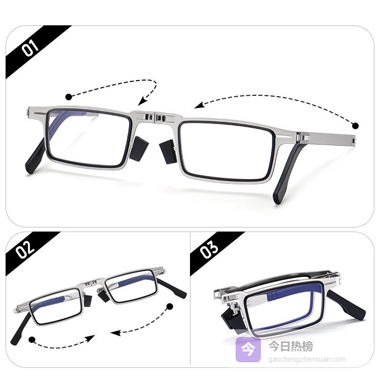 三、技术亮点与实际体验:相比传统老花镜,折叠款在便携性与功能整合上更具优势。其三步折叠设计(展开镜腿、折叠镜框、收纳镜片)可缩短操作时间,配合独立收纳盒可避免镜片刮擦。防蓝光镀膜通过物理阻隔减少有害光摄入,配合非球面镜片减少边缘畸变,提升阅读或看手机的清晰度。此外,部分产品采用可定制服务,用户可根据脸型调整镜腿长度或鼻托高度,进一步优化佩戴舒适度。在材质选择上,金属镜架侧重耐用性,TR90镜架则以抗冲击、耐腐蚀为特点,适应不同使用习惯。