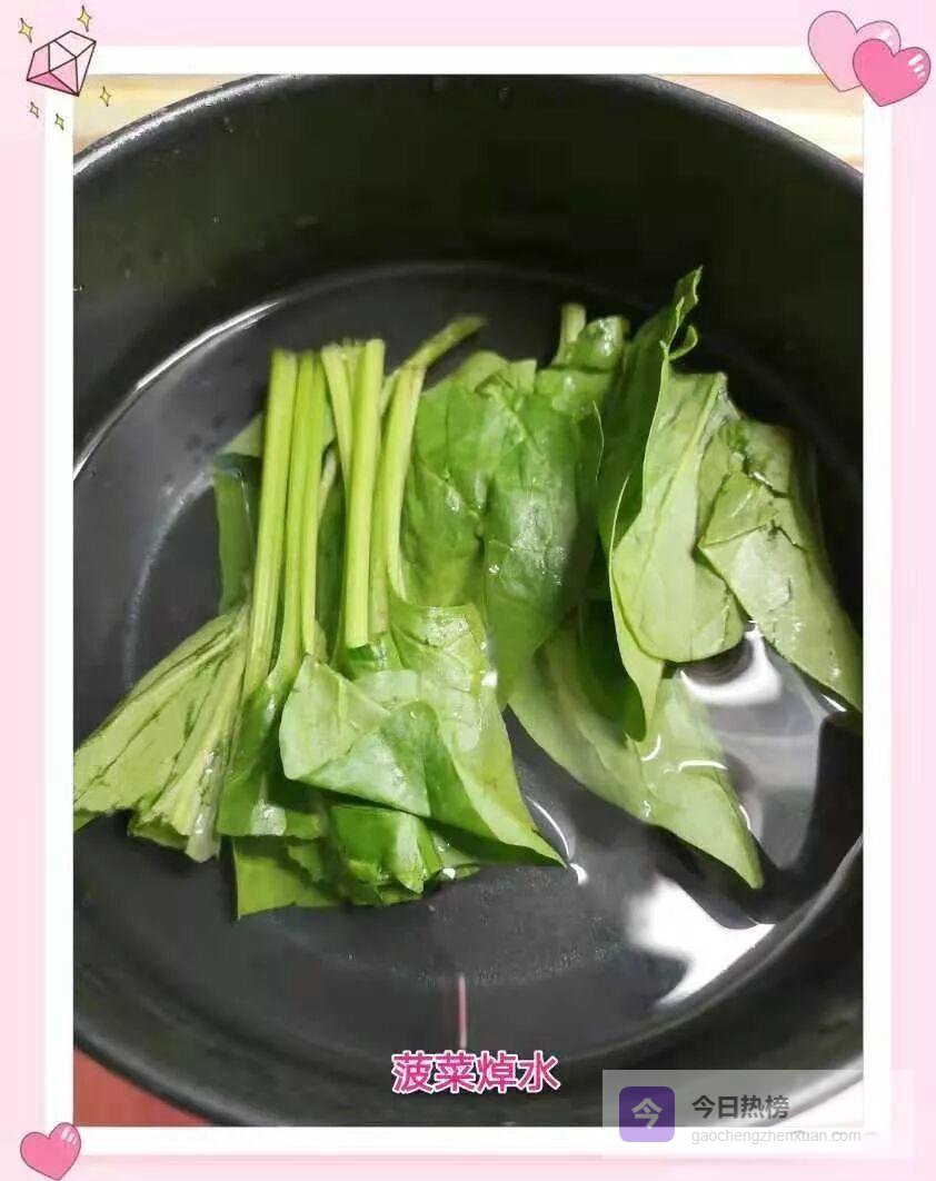 3.1 △ 预处理土豆去皮切2毫米小丁,铺在蒸盘上;菠菜去根留叶,用沸水快速焯30秒去草酸。