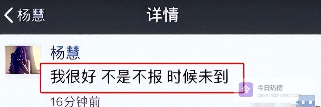在王宝强公开声明后,杨慧也在朋友圈感到欣慰,表达祝贺:“不是不报,时候未到”,同时向亲友们透露了自己的离婚消息。