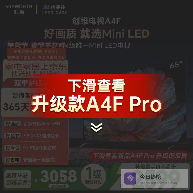 【京东自营】创维电视A4F65英寸百级分区MiniLED144Hz高刷HI-FI音响一级能效国家补贴¥