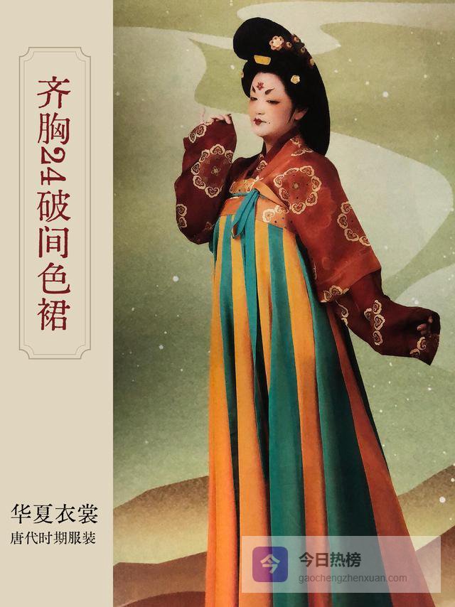 齐胸衫裙加帔帛是标志性打扮,杨贵妃偏爱紫黄二色,引领天宝年间流行风尚。