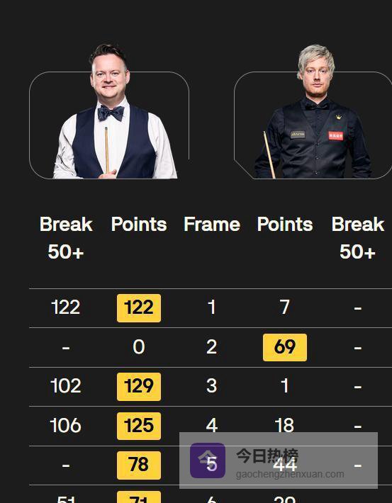 罗伯逊整场比赛竟没有一杆50+进账,状态之差可见一斑。 这场大胜是墨菲强势晋级之路的延续,在此前的四分之一决赛中,他曾以5-1横扫卫冕冠军凯伦·威尔逊,展现了极佳的竞技状态。