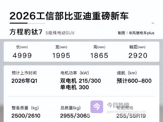 方盒子能耗高已经是常识,就在方程豹推出钛7插混车型的时候,还有人问“什么时候能出纯电车型”,没想到3个月后就迎来其申报的消息。纯电钛7提供单电机(300kW)和双电机(前215kW/后300kW,综合功率515kW)版本,最高车速240km/h。