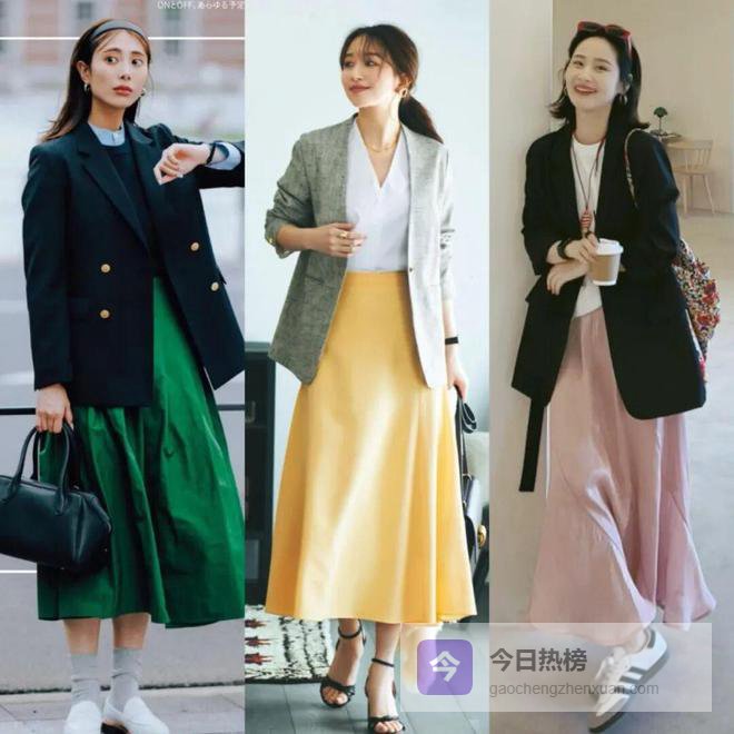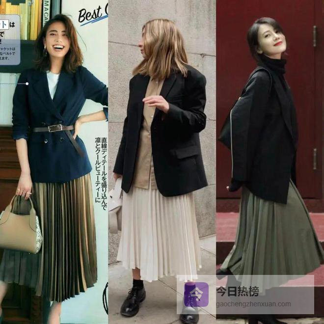 百褶裙的风琴褶皱赋予了长裙如水般的流动感和立体感,当它与线条简洁流畅的西装外套结合,既能展现学院风的文艺减龄,又能穿出知性优雅的女人味。