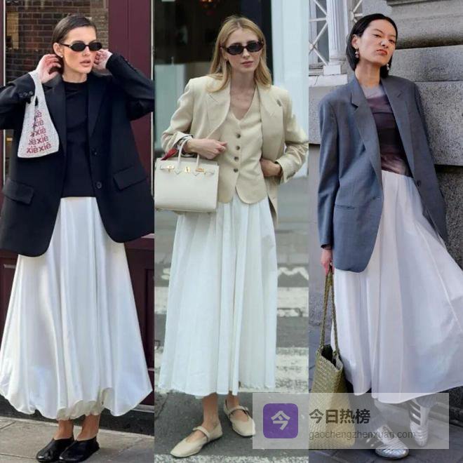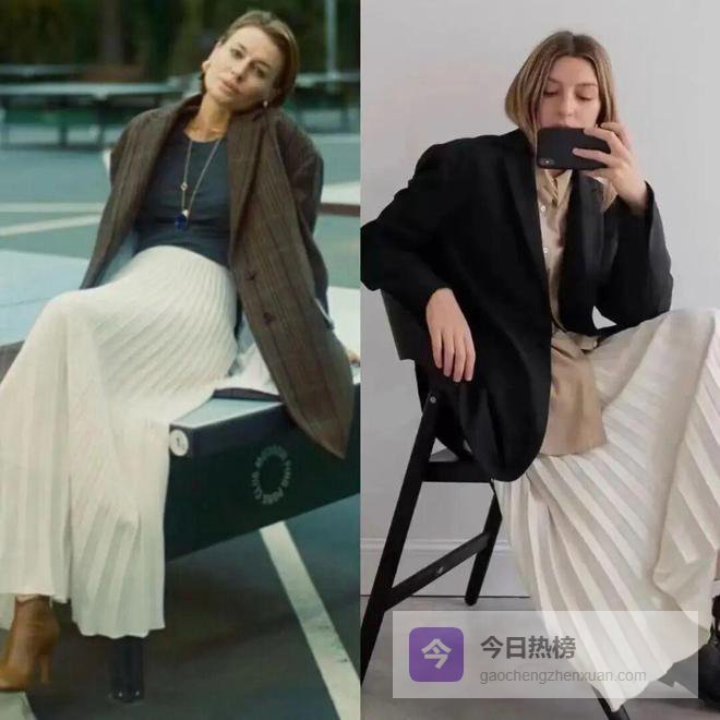 百褶裙的温柔浪漫可以中和西装的严肃正式,穿出气场的同时也很减龄。如果我们衣橱里的西装都是沉稳的深色系,这时候百褶裙不妨选择干净的白色。