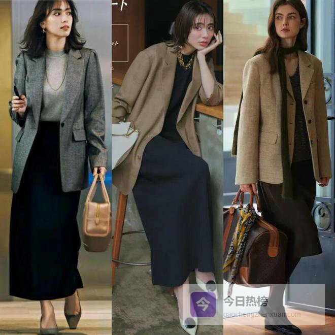 如果要让整体更有层次,外套和内搭可以选择深浅对比色,搭配与内搭同色的直筒半裙,视觉上显高又显瘦。