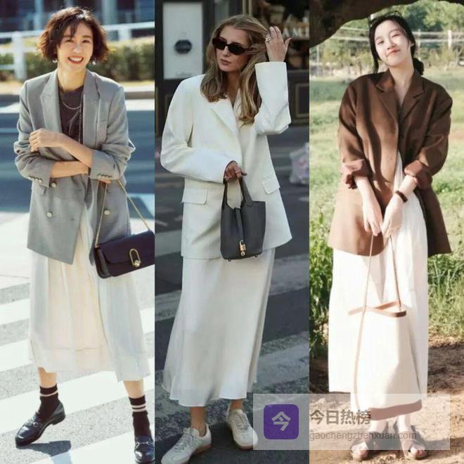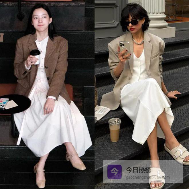 想要更清爽减龄,推荐选择柔和的暖色调西装外套搭配白色长裙,比如栗子棕、米杏、燕麦色等,白色能够放大了暖色调的质感,同时弱化了西装外套的攻击性,让整个人看起来更亲切随和。