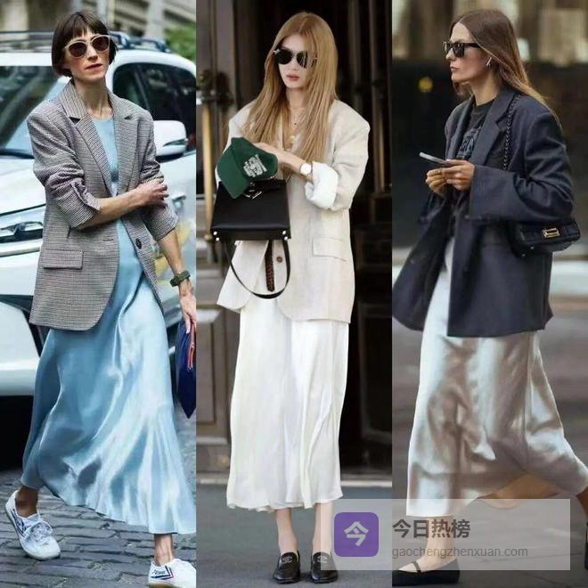 及踝缎面裙流畅的垂坠感勾勒出若隐若现的腿部线条,举手投足之间尽显优雅从容,即使出席正式场合,西装与缎面裙的组合也能轻松应对。