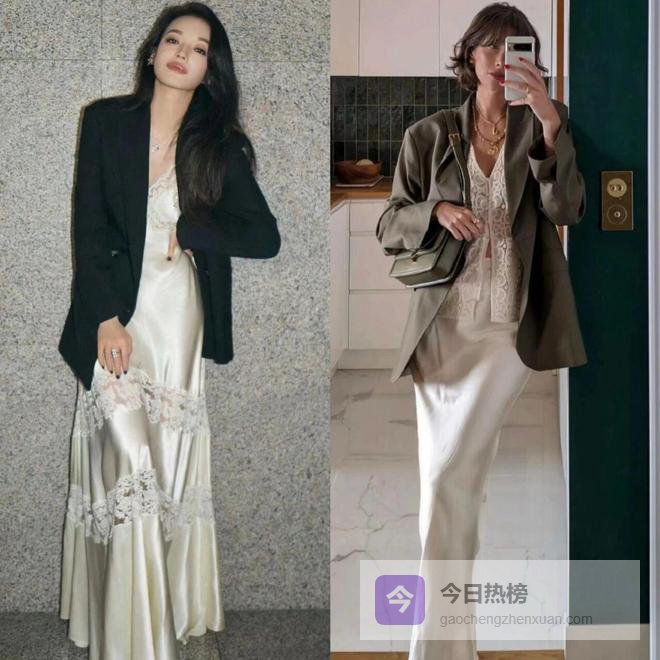 很多人可能会担心缎面裙太挑身材,这时候西装可以稍微选长一点,刚好盖住臀部和胯,又可以适当遮挡腹部。