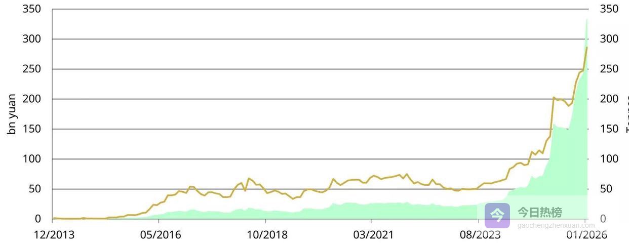 这场由国家层面推动的战略布局,其实和我们每个人的钱包息息相关。 最直接的表现是,中国人投资黄金的热情正在爆炸式增长。 2025年,中国黄金ETF的资产管理规模暴增了243%,达到2420亿元人民币,持仓的实物黄金翻了一倍多。 进入2026年仅第一个月,又有440亿资金和38吨黄金涌了进来,创下史上最强的开年纪录。