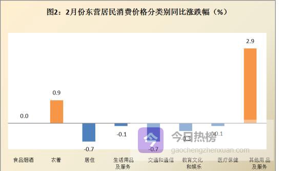 环比看,2月CPI由上月上涨0.5%转为下降0.4%。食品价格环比下降2.1%,非食品价格持平;消费品价格下降0.6%,服务价格也持平。