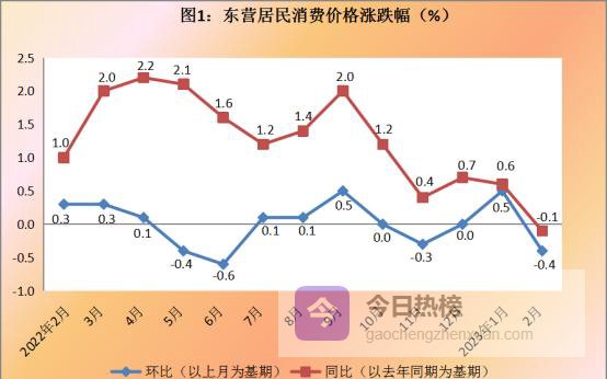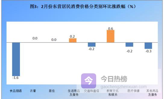 2月份,东营居民消费价格指数(CPI)同比下降0.1%,涨幅比上月收窄0.7个百分点。其中,食品价格同比上涨1.3%,非食品价格则下降0.5%;消费品价格下降0.1%,服务价格下降0.3%。
