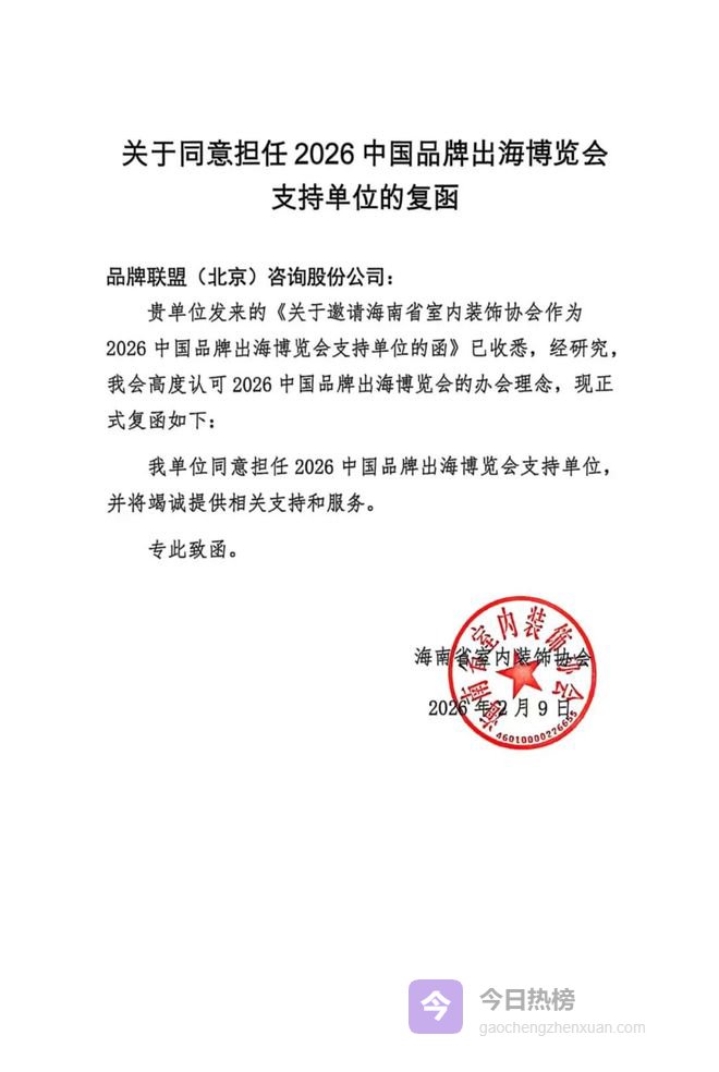 近日,海南省室内装饰协会正式复函,确认成为2026中国品牌出海博览会(简称“出博会”)支持单位。作为支持单位,协会将积极组织会员企业参展,并广泛邀请专业观众莅临现场,共同探索品牌出海新机遇。