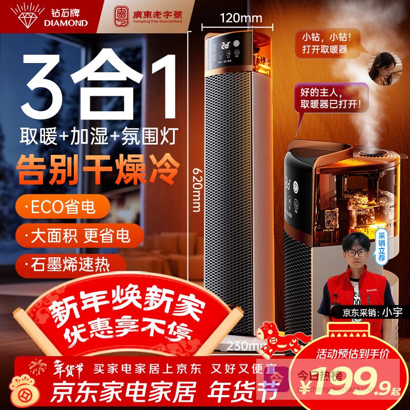 钻石牌(DIAMOND)取暖器家用石墨烯智能语音氛围灯加湿暖风机立式取暖神器冬季电暖风浴室热风机节能速热电暖器MX¥