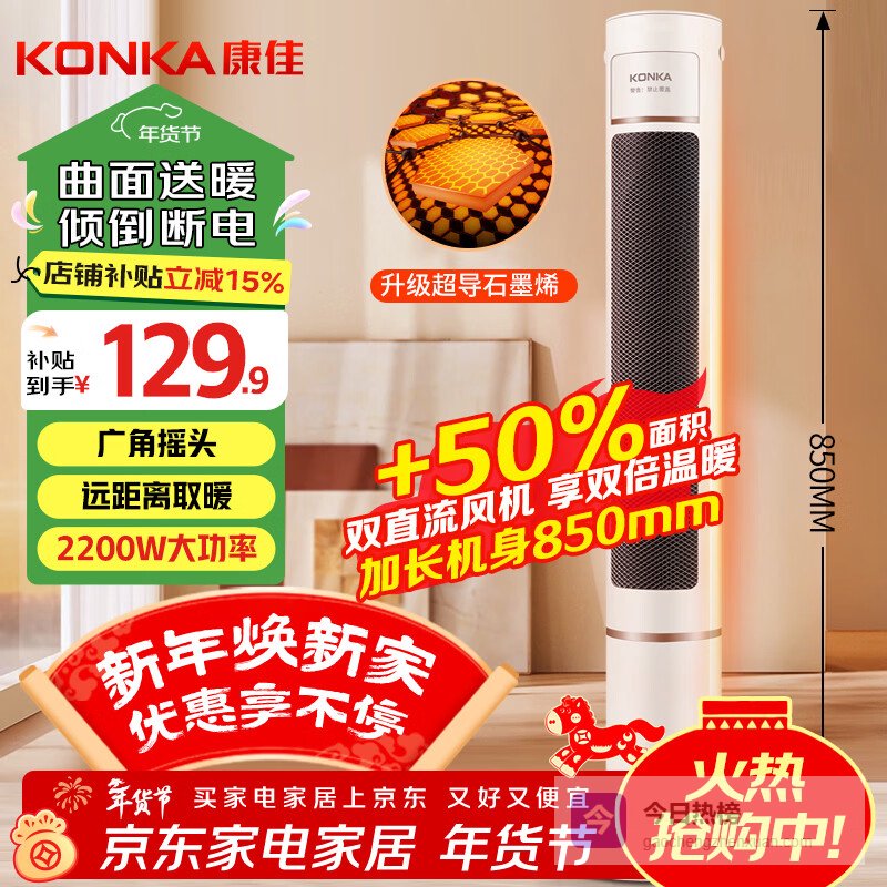 康佳(KONKA)取暖器家用石墨烯暖风机立式电暖气浴室电暖风节能热风机速热暖风扇摇头电暖器烤火炉KDNF-2207-P¥