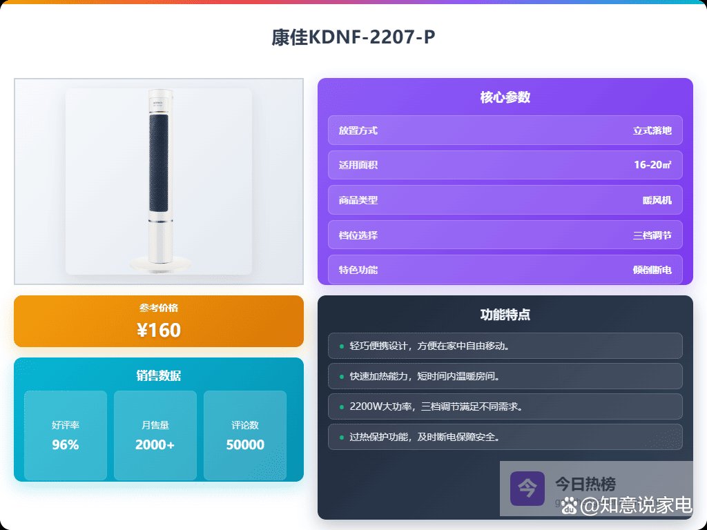 安全方面,康佳KDNF-2207-P配备了倾倒断电和过热保护功能,使用中更安心。设备设计注重用户体验,轻巧便携,顶部操作按钮方便调节。耐用的出风口和散热孔保证设备长时间稳定运行,冬天使用无后顾之忧,整体评价还行,性价比挺高的。