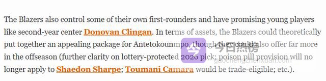 此外,开拓者还握有部分自家首轮签,队中也不乏潜力新星,例如二年级中锋克林根。从筹码层面来看,开拓者理论上能够为得到字母哥拼凑出一份颇具吸引力的交易方案,不过到了休赛期,他们能拿出的筹码还会更加丰厚(2026年受乐透保护的首轮签归属将更加明确;谢登-夏普合同中的毒药条款将失效;图马尼-卡马拉将具备交易资格,等等)。